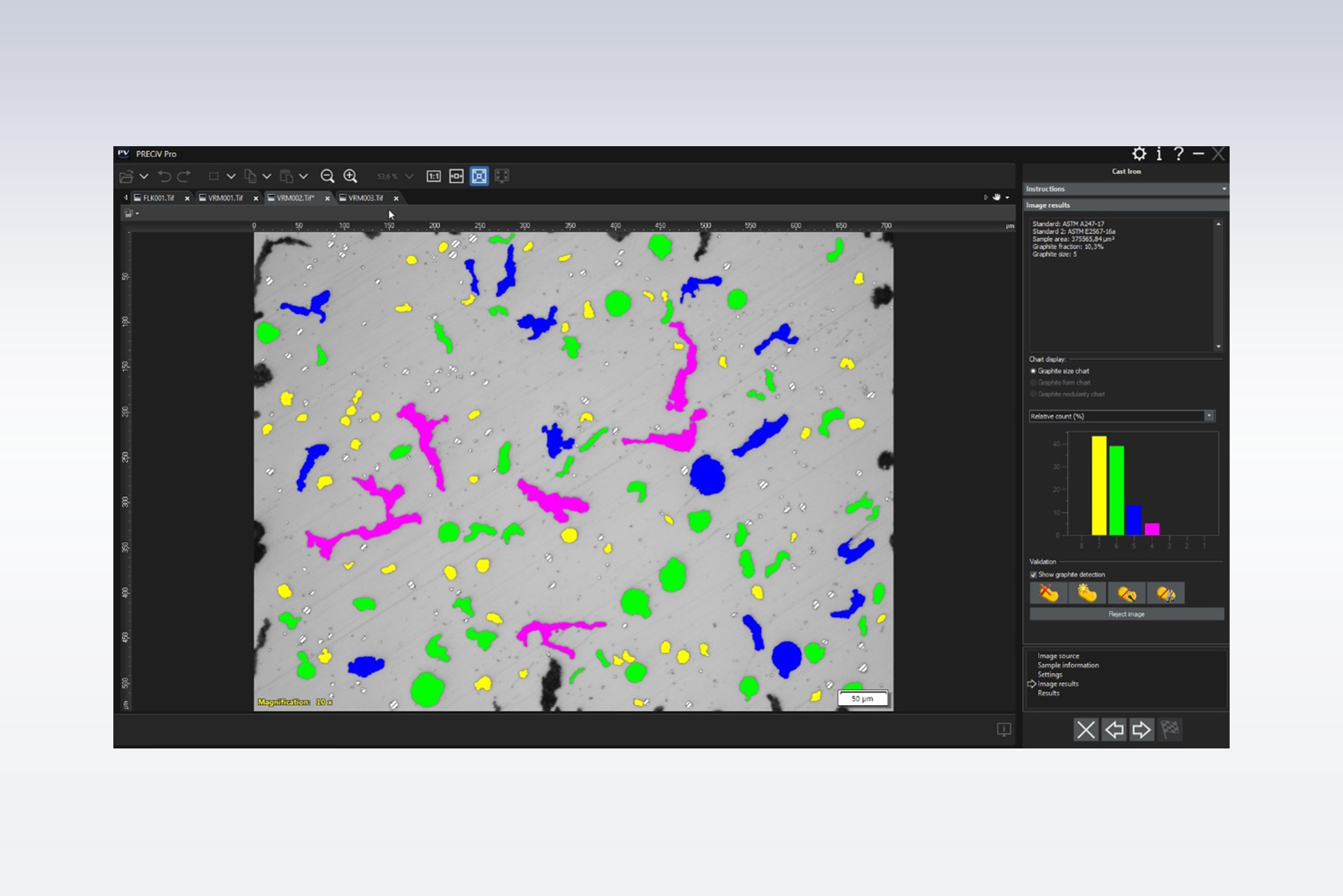 Kullanımı kolay PRECiV™ yazılımı, üretim, kalite kontrol ve inceleme işlemleri sırasında tekrarlayan 2D ölçümler yapabilmeniz için mikroskop üzerinde tam kontrol sağlar. EN ISO 945, ASTM E112, ASTM E45, EN 10247 ve DIN 50602 gibi uluslararası standartlara göre çelik malzemelerde tane boyutu, kirlilik ve inklüzyon analizleri, dökme demirlerde nodülerlik (nodülarite) ve ferrit - perlit oranı, partikül sayımı ve sınıflandırılması gibi birçok analizi yapmanızı sağlar. Akıllı rehber sayesinde tekrarlanabilir ve güvenilir sonuçlar alırsınız.